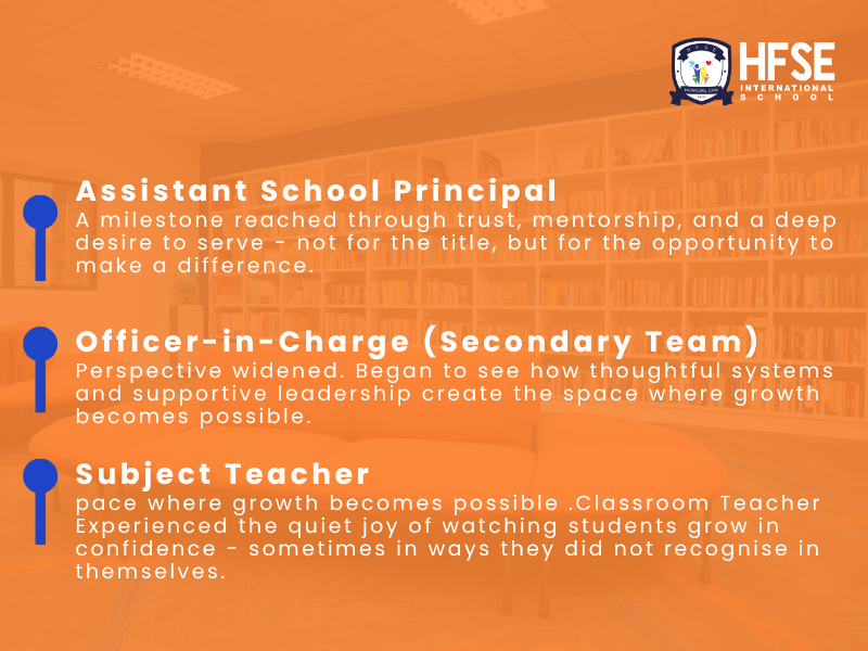 Her story continues to inspire both educators and students within the HFSE community. It shows that leadership develops through trust, experience, and a genuine desire to serve others.